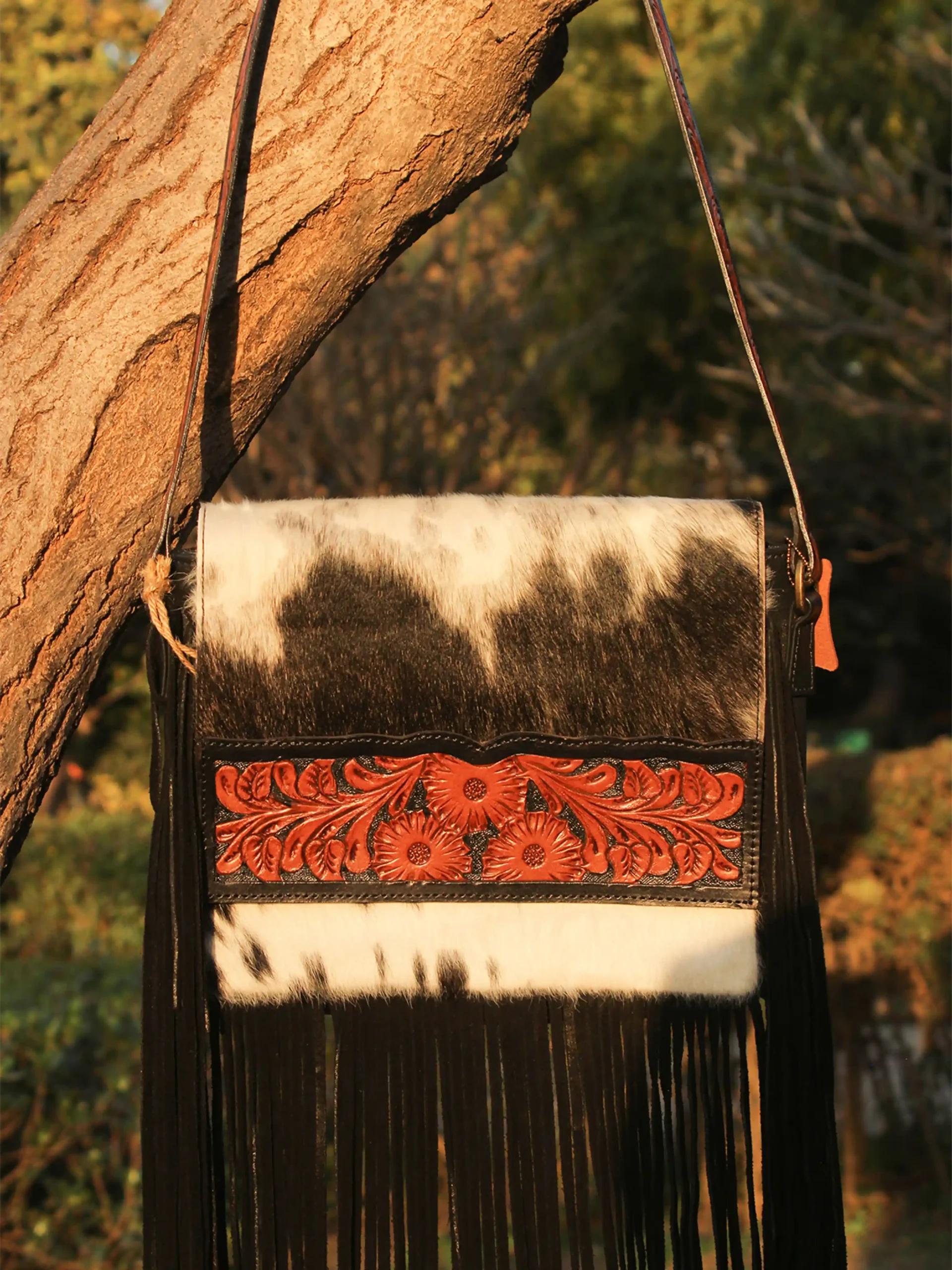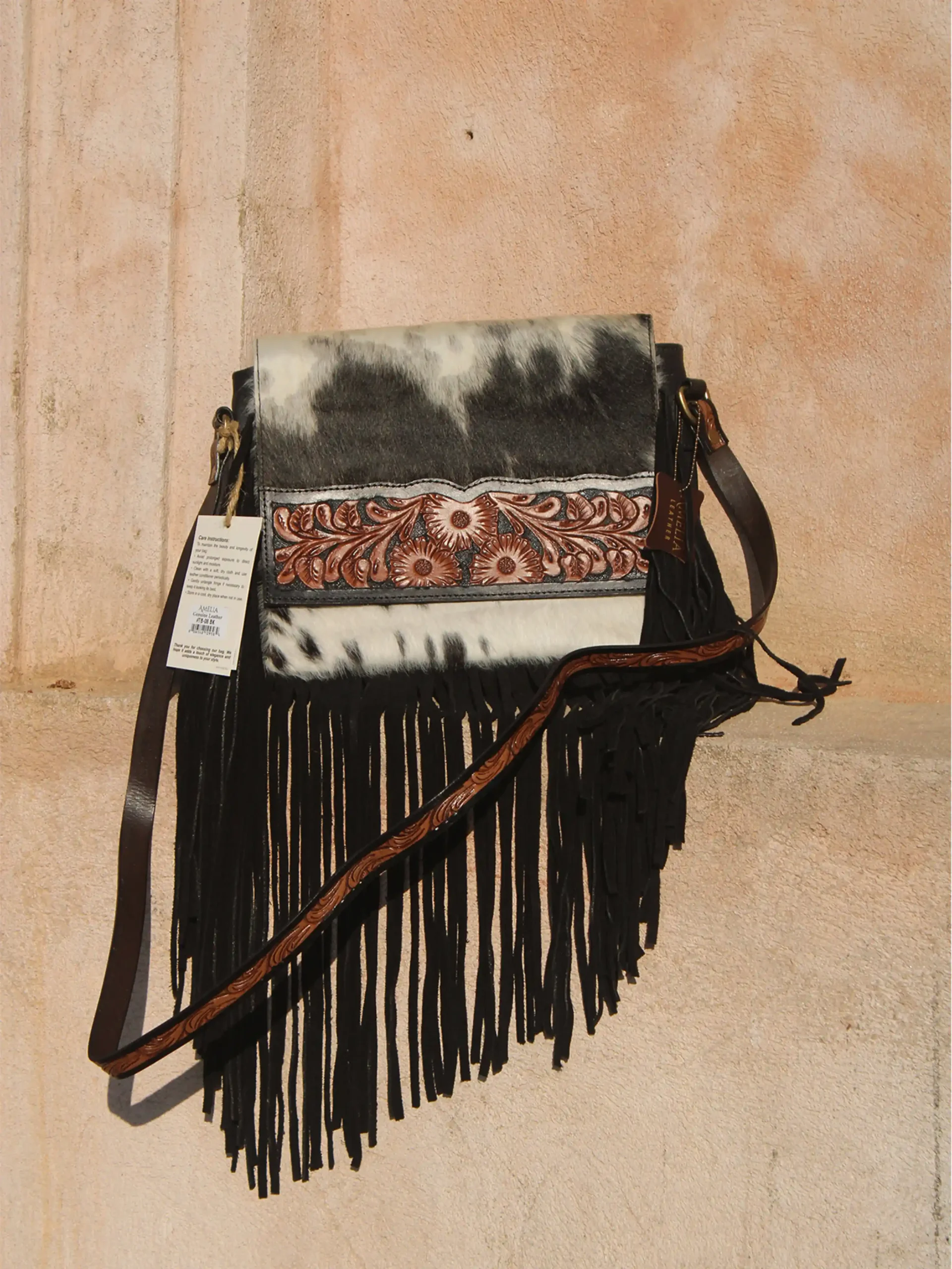 This handcrafted shoulder bag features a bold black-and-white cowhide body paired with a richly tooled leather flap and matching strap. Accented with long black fringe and magnetic snap closures, it blends western charm with bohemian flair. The spacious interior and secure zippered pocket make it both stylish and functional—perfect for everyday wear or standout occasions.