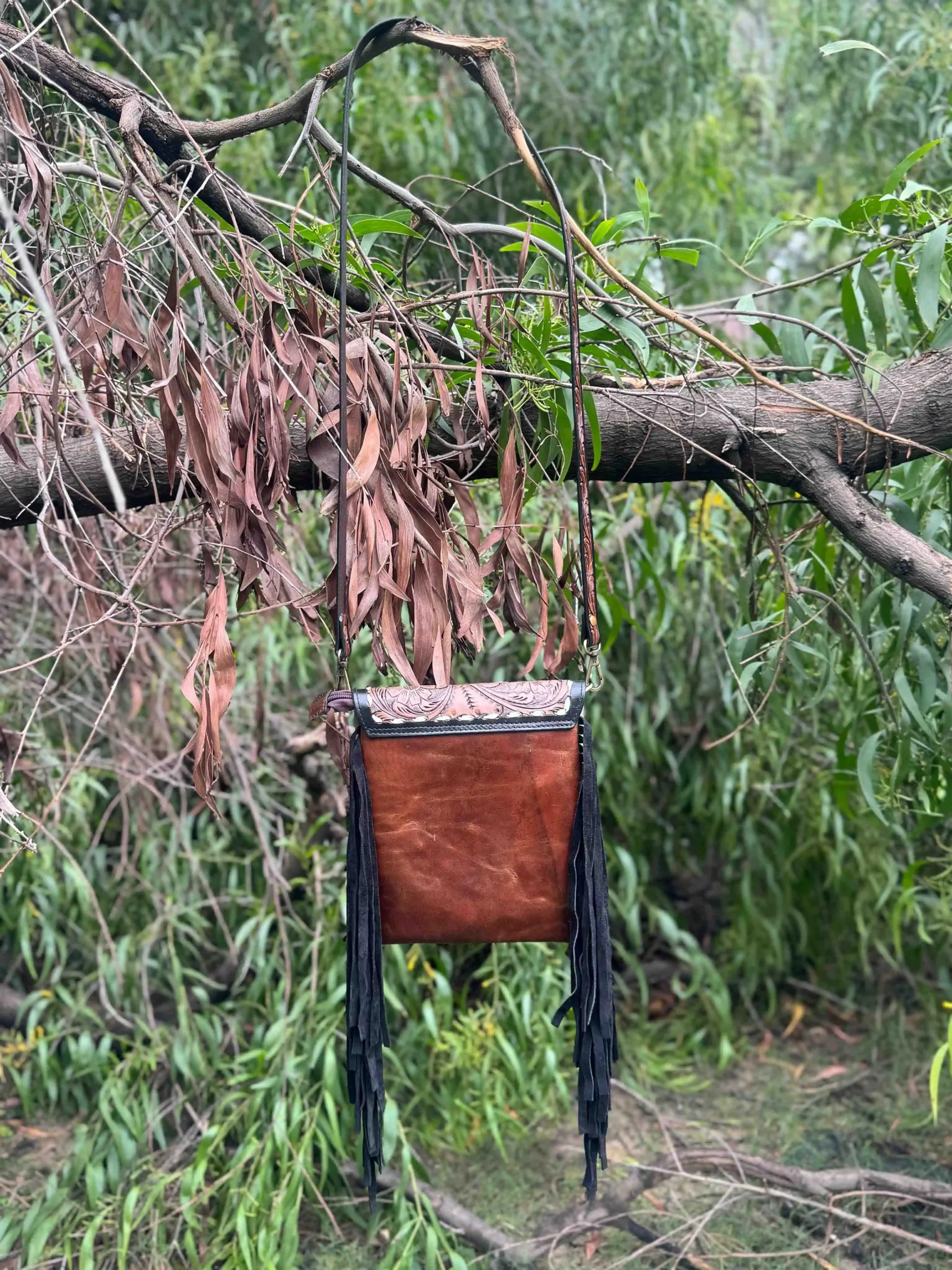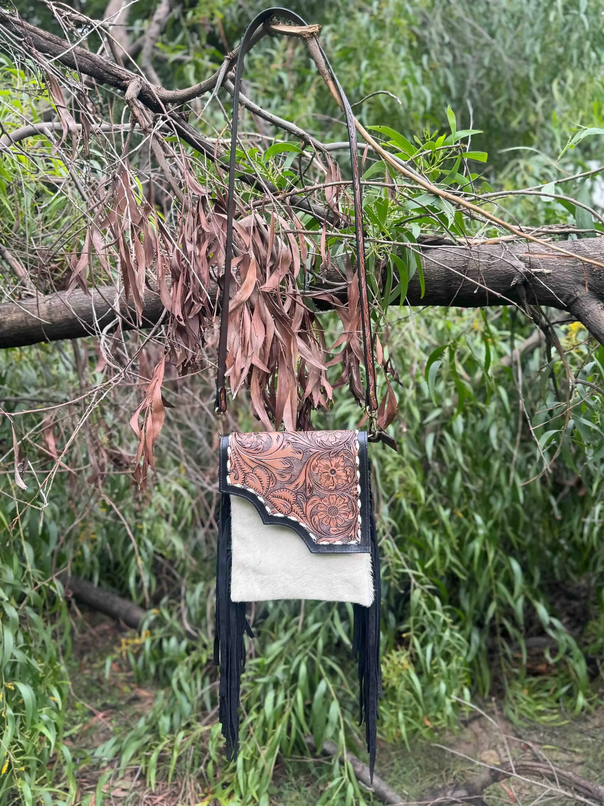 Beautifully crafted crossbody bag featuring a tooled floral leather flap, genuine hair-on body, and long fringe details. Designed with an adjustable strap and sturdy hardware, this bag combines Western charm with everyday functionality. Perfect for casual outings or adding a rustic touch to your look.