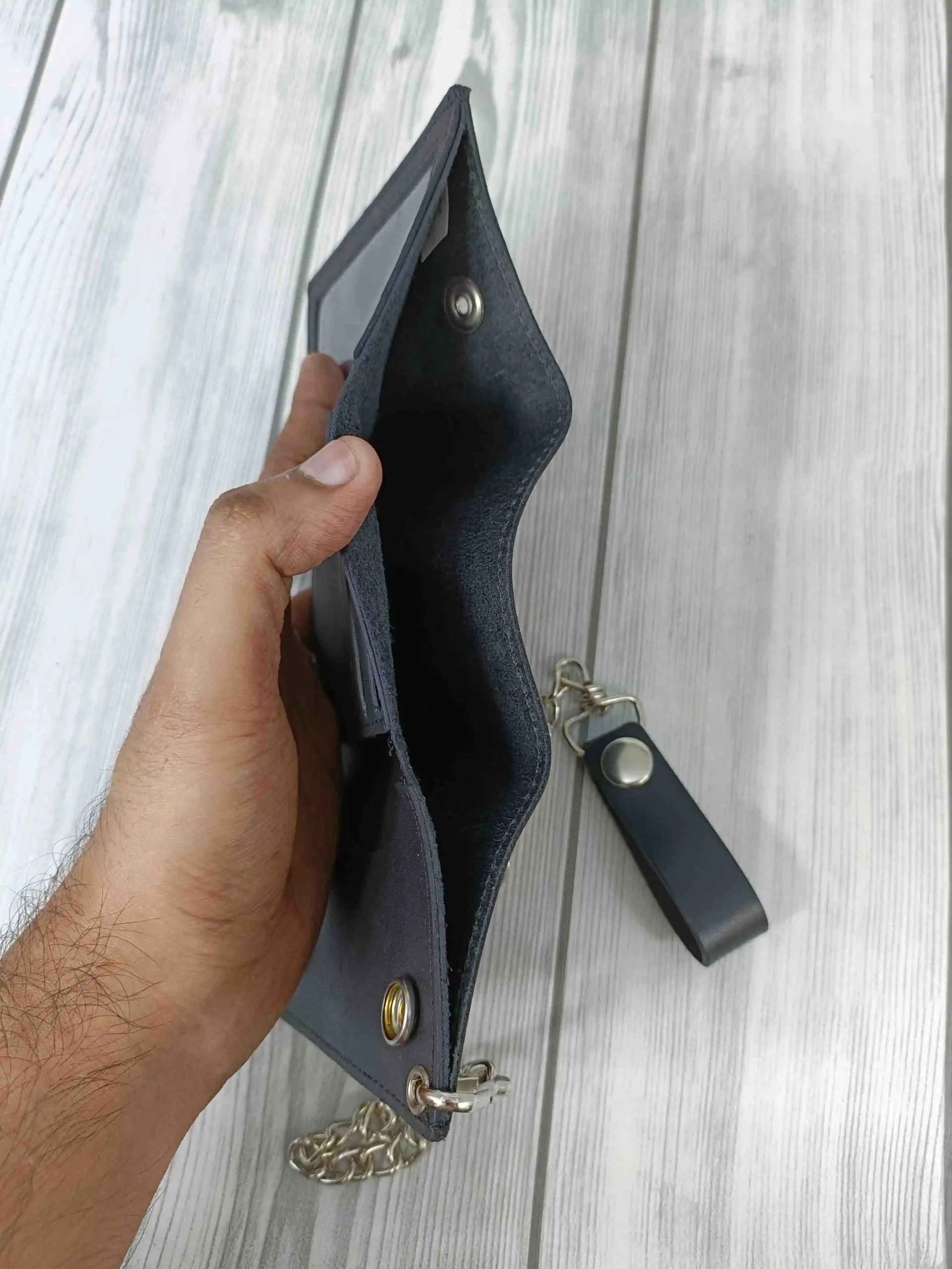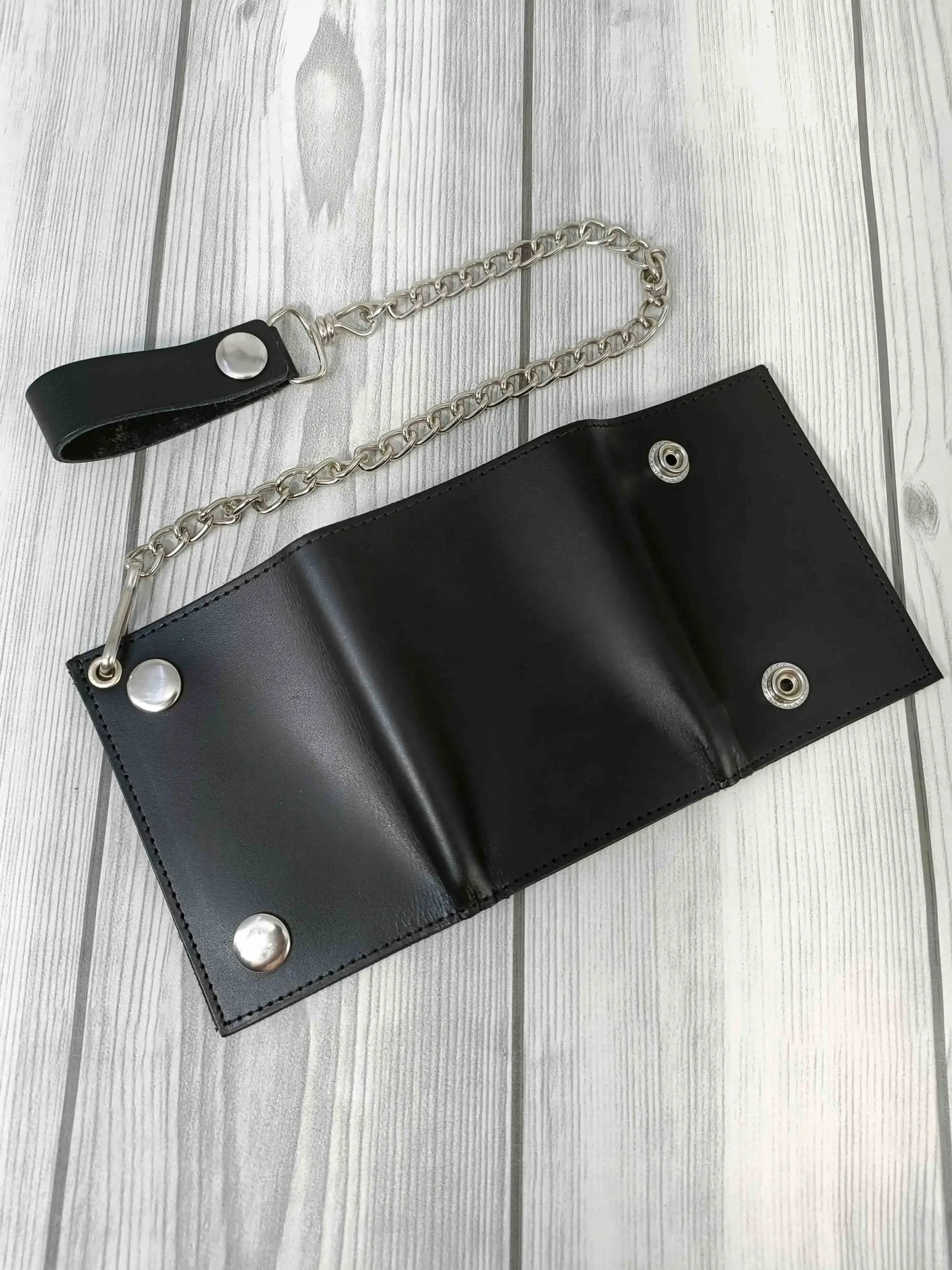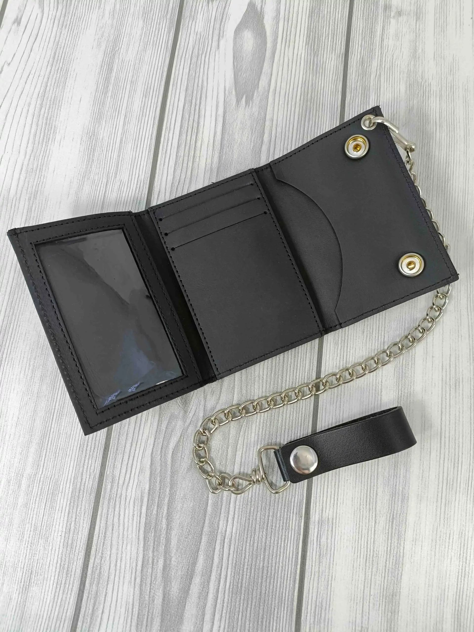 This rugged bifold wallet is crafted from 100% genuine cowhide leather, designed for men who value durability and style. Featuring 5 card slots, bill compartment, a clear ID window, and a secure coin pocket, it offers practical organization with a bold biker-inspired edge. The attached 12″ silver chain and leather strap ensure added security. Finished in sleek black with triple snap closures, it’s a compact, functional accessory built for life on the move.